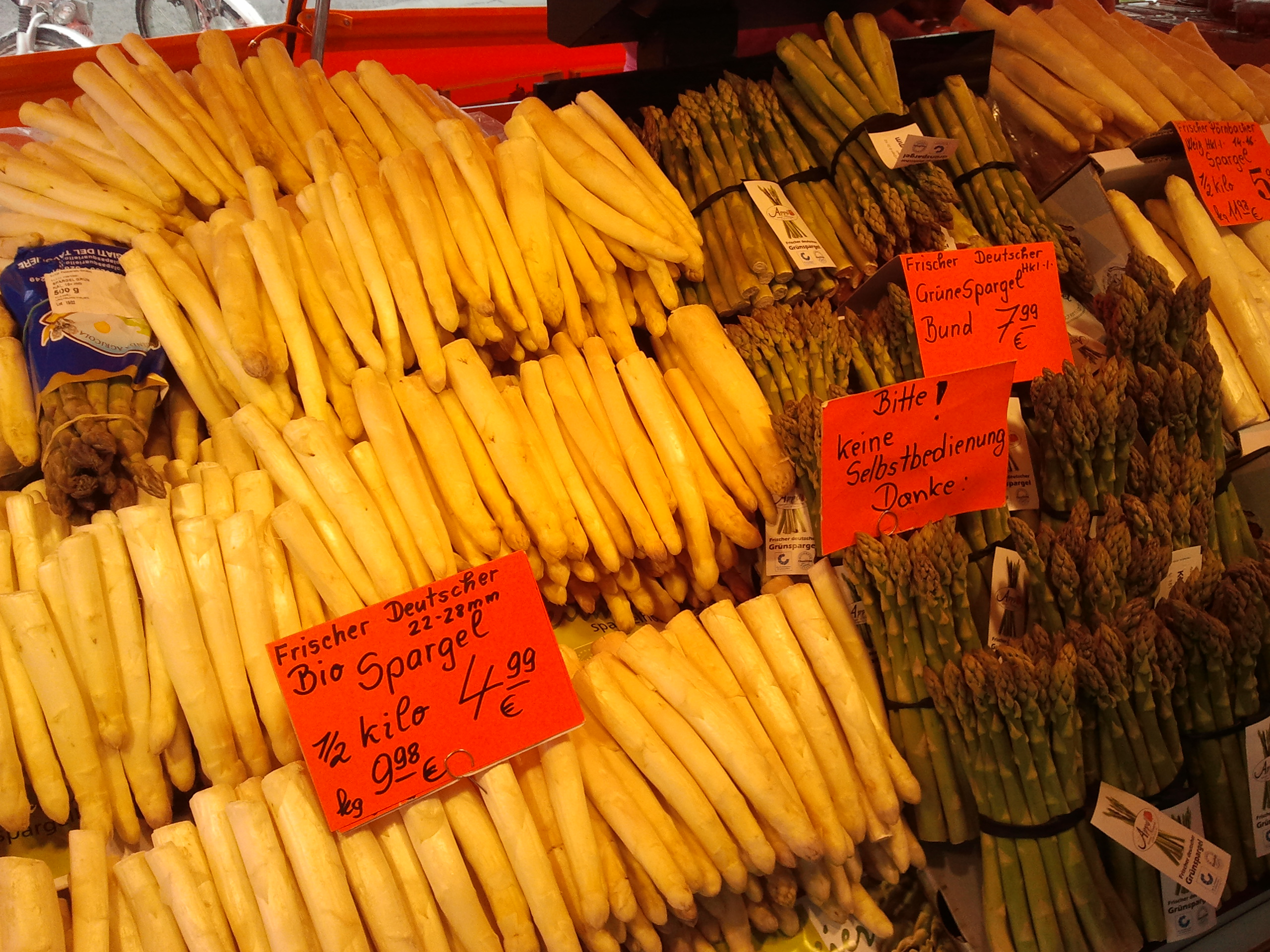 Trenutno se na skorom svakom koraku nude šparoge i pri tome postoji razlika u cijeni između bijelih i zelenih iako su i zelene daleko od onih tankih šparoga na koje smo navikli. Doduše i cijena je puno veća. Tako stručak zelenih košta oko 8 eura, dok je pola kile bijelih šparoga iz uzgoja (s neizostavnim predznakom BIO) 5 eura.