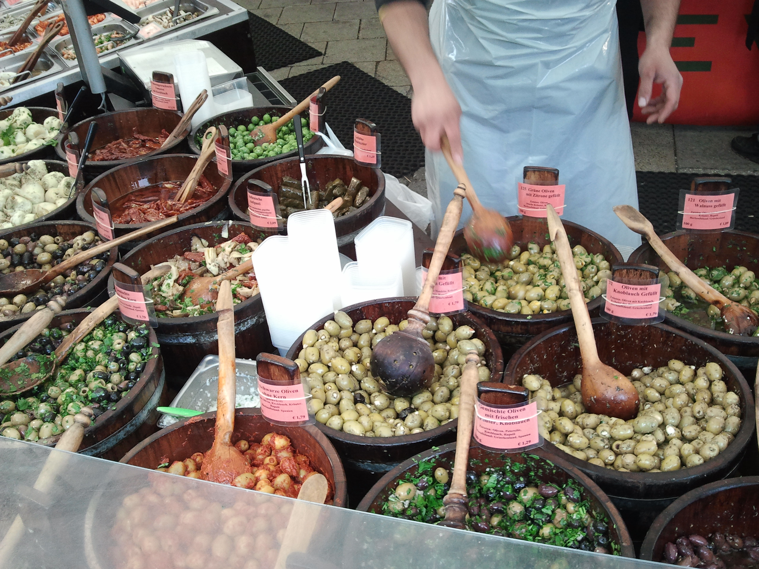 Njemačka možda nije poznata po maslinovom ulju ali zato se prema viđenom na tržnici mogu pohvaliti konzerviranjem maslina. Ponuđene u velikim drvenim posudama masline su punjene gotovo svačim, pa čak i limunom, češnjakom ili orasima. Cijena? Deset deka košta oko 1,80 ili 13 kuna.