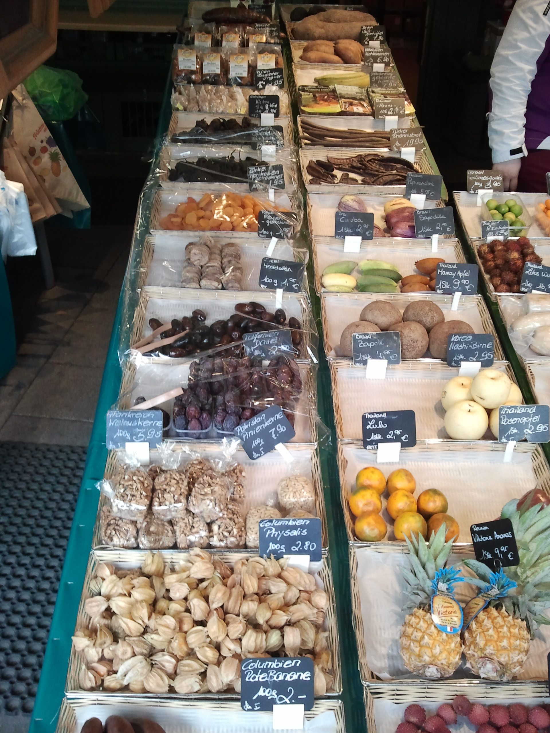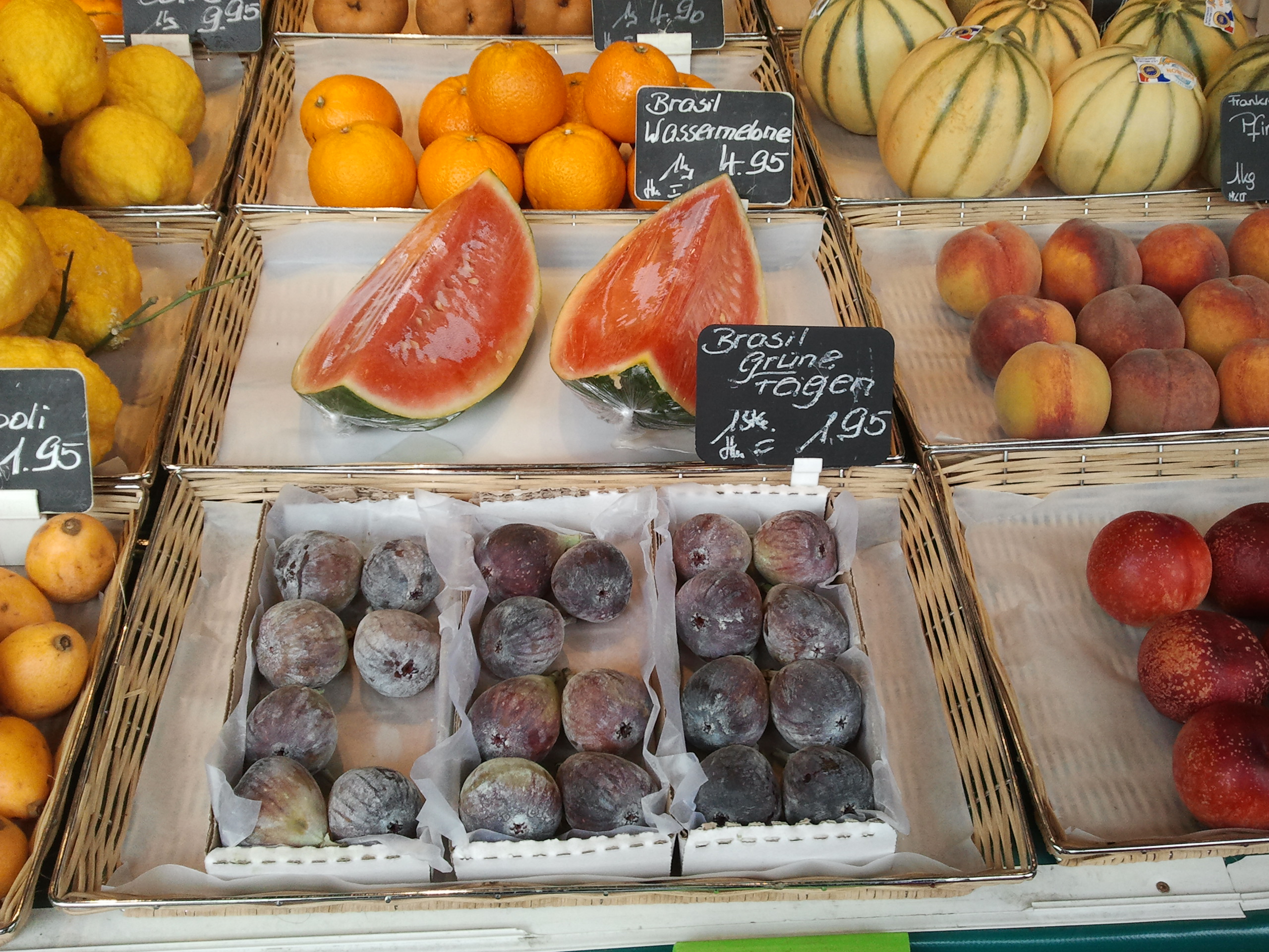 Malo dalje od šparoga nalaze se štandovi na kojima se nudi egzotično voće. Zanimljivo je da se uz datulje, mango i papaju nude i voćke koje su u Dalmaciji sve samo ne egzotične: mindeli, rogači i smokve ovdje drže iznimno visoke cijene, i većina je uvezena iz Turske. Rogač, u puku poznatiji kao kruh svetog Ivana ili hrana za siromašne, kod nas se najčešće doživljava kao hrana za magarce i mule, međutim posjet Viktualienmarkt natjera vas da dvaput razmislite. Cijena kilograma rogača tu je 20 eura, što je dva i pol puta skuplje od recimo papaje, a slično ćete izdvojiti i za smokve ili mindele koji se prodaju na deke. Tako deset deka sušenih smokava ili neoljuštenih, još zelenih mindela iz Turske košta 1.95 eura što je gotovo 15 kuna. Svježe smokve pak dolaze iz Brazila i u tom slučaju cijena samo jednog komada je 1.95. Ako pak poželite trešnje dok one naše u Kaštelima ili Šibeniku ne sazru, 100 grama Francuskih trešanja sada ćete platiti 14,95 eura, a prije nego što sazru neretvanske lubenice možete kušati brazilske i to za gotovo 5 eura po kilu. Šipak koji kod nas dozrijeva na jesen sada se na Viktualinemarktu uvozi iz Indije i prodaje za 5,95 eura po komada, dok se među uvoznom robom može naći čak i talijanski mladi krumpir za 5 eura po kili. Iako se mnoge od ovih cijena čine pretjeranima, treba uzeti u obzir da je München prema nekim studijama grad s najvećom privrednom snagom i najvišom kvalitetom života, stoga je očito da postoji i raznovrsna potražnja te kupci koji su si spremni priuštiti proizvode po višim cijenama. Viktualienmarkt zato nudi svo voće, bez obzira na godišnje doba. Mene jedino zanima koliko bi onda koštao uvoz iz Nijemcima bliže Hrvatske za koji mjesec kada kod nas sazru recimo rogači ili smokve?