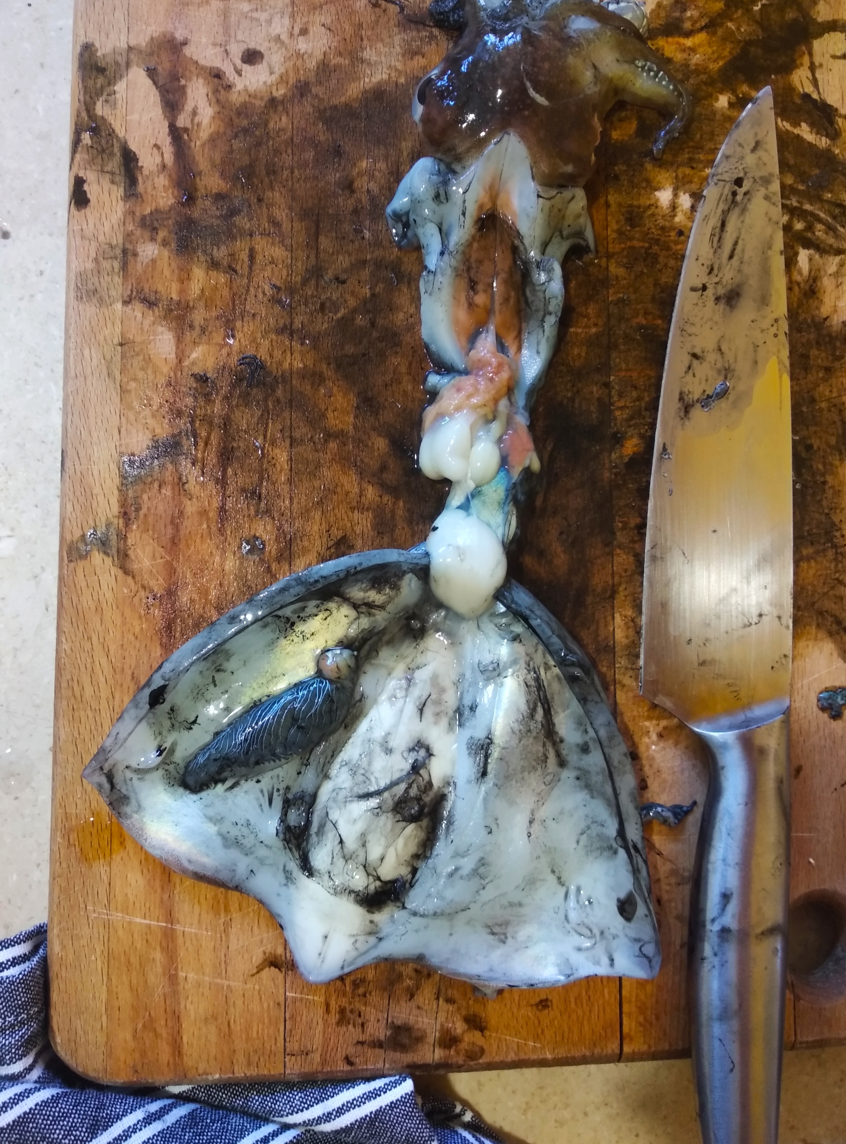 🢣 Osti ili mreža: od dvije sipe koje sam spremala jedna je bila uhvaćena mrežom, druga ostima. I dok ćete onu uhvaćenu mrežom morati malo bolje isprati zbog pijeska, meni je ona osobno draža jer se kod sipe uhvaćene ostima zna dogoditi da crnilo bude probijeno. To mi se sada dogodilo i crnilo sam iz nje morala nacijediti iz mjehurića (zato je daska na drugoj slici sva crna).