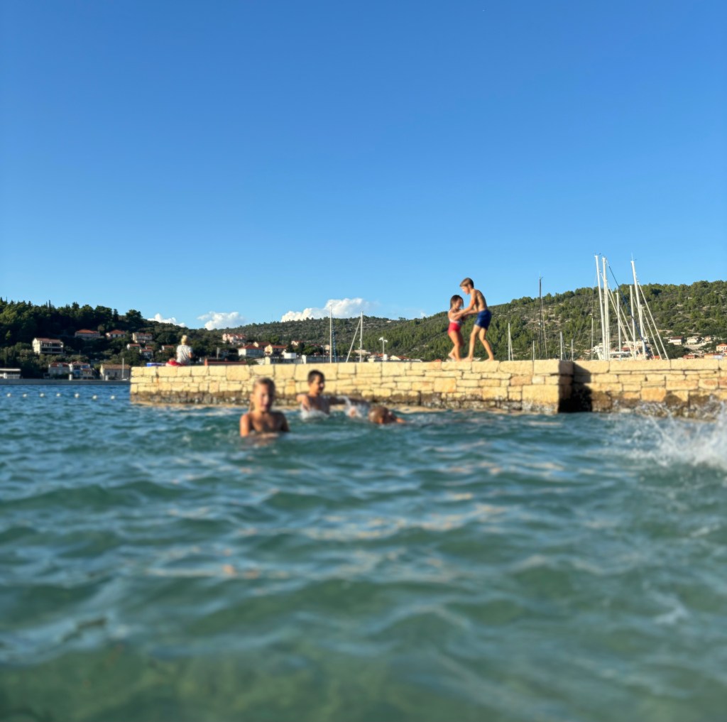 Zanimljivo je koliko ljudi tu opušteno dolaze. Ako si u staroj robi za po doma: može. Ako je roba za po doma najgore kategorije (nabužana): može. Dijete je došlo boso: može. Najmanji je došao samo u pelenama: može. Možda je tako opušteno zato što znate da nema crtića kroz jutro. Nema mama dosadno mi je i ono najbolje, toliko će se umoriti da će poslije zaspati. Možda se baš zato, iako nečujan, onaj osjećaj olakšanja kada s djecom napokon dođete na ovu plažu i spustite sve torbe, gotovo može čuti.