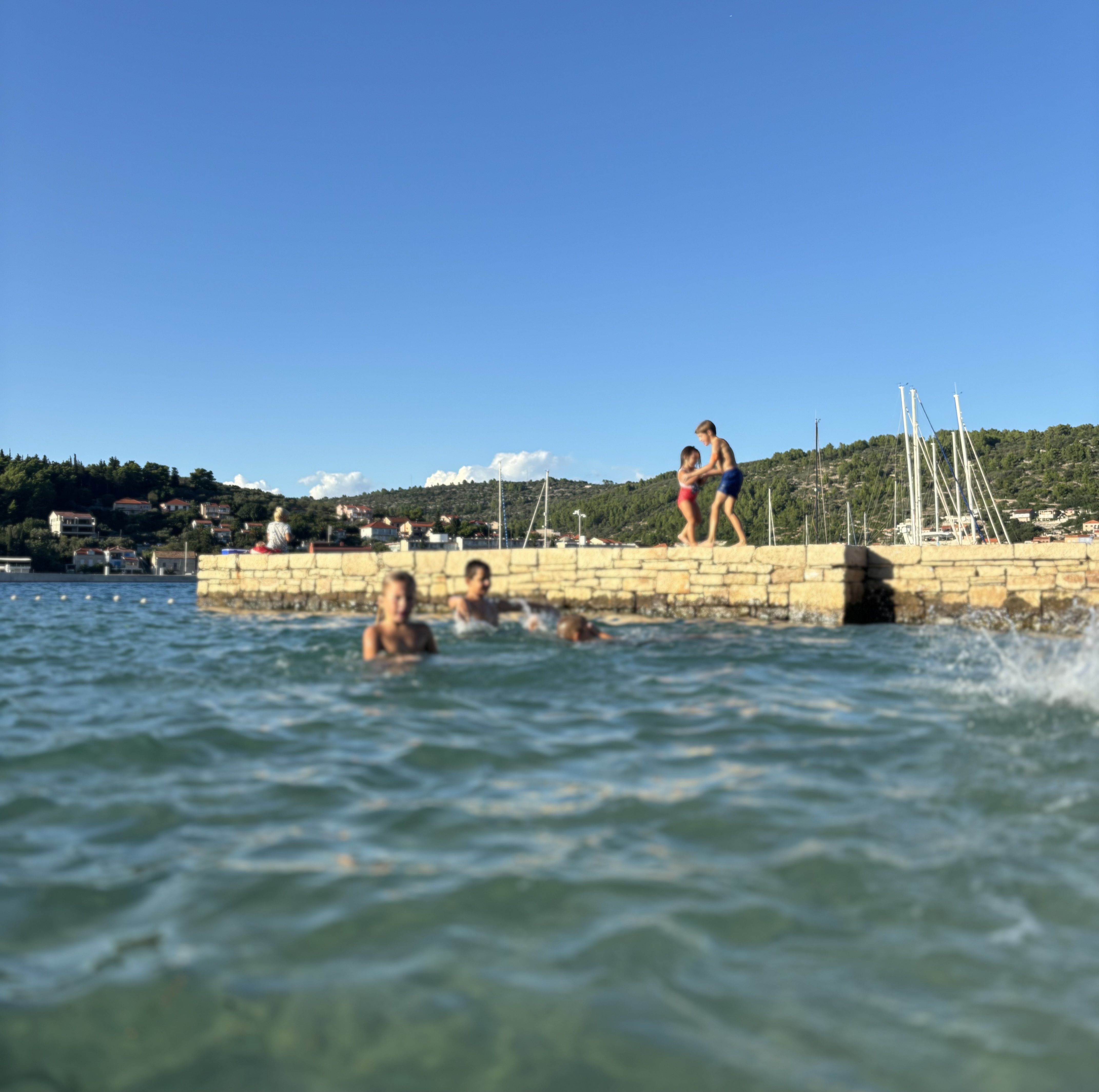 Mame se poredaju na ručnicima uz more kao kokoši na gredici, i budno gledaju piliće. Jedna bude zadužena otići po kavu, a kad kava stigne, taj mali komad zidića između plaže i mora postaje najljepši štekat na cijelom Jadranu. Nakon obaveznog: „I ženske, što ima nova?“, uslijedi standardno: „Ema, nemoj u duboko! Toni, pusti sestru na miru! Zvonimire, dođi pojest voće!“ Svi ti povici uskoro se izmiješaju s dječjim smijehom i trkom u jedan ritam ljeta. Kad im dosadi plaža, kad more odnese kantice i pusti se koja suza zbog izgubljene maske, onda se povuku ispod borova. Tu se sada nalazi mali dječji park, dovoljan da se svi zajedno popnu u kućicu od tobogana, braća posvađaju sa sestrama, onda pomire, onda opet posvađaju, i vrate se k moru.